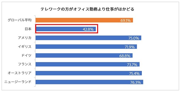 「テレワークの方がオフィス勤務より仕事がはかどる」と答えた人は、グローバルで平均69.1%だったのに対して、日本は42.8%と、調査対象国の中で突出して低く、7カ国中唯一、「テレワークだとはかどらない」人が多数派だった。