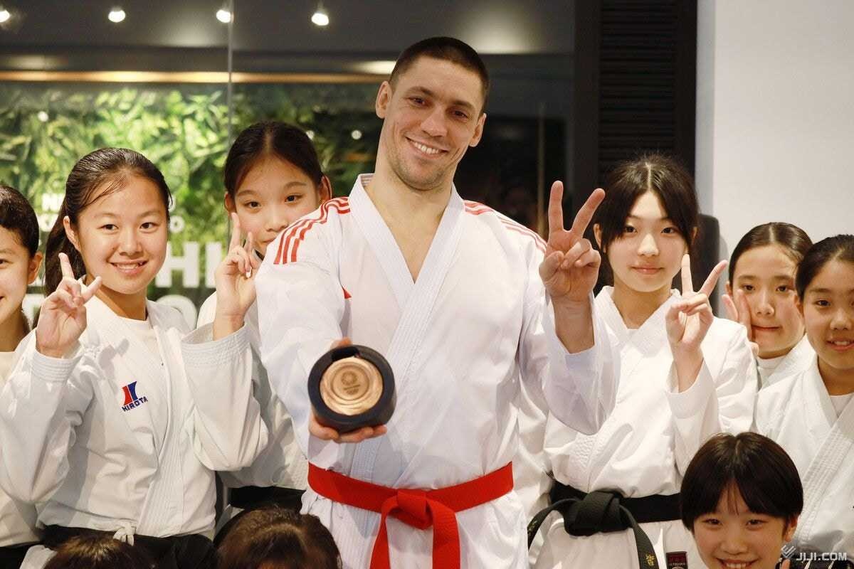 2021年東京五輪の空手男子組手75キロ級でウクライナのスタニスラフ・ホルナさん(37)が獲得し、戦渦の母国を支援するため競売にかけた銅メダルが5日、無償で本人に返還された。日本人落札者の申し出で実現。東京都内の空手道場でメダルを首に掛けられたホルナさんは「このような機会に感謝したい。一生忘れない」と笑顔で語った。