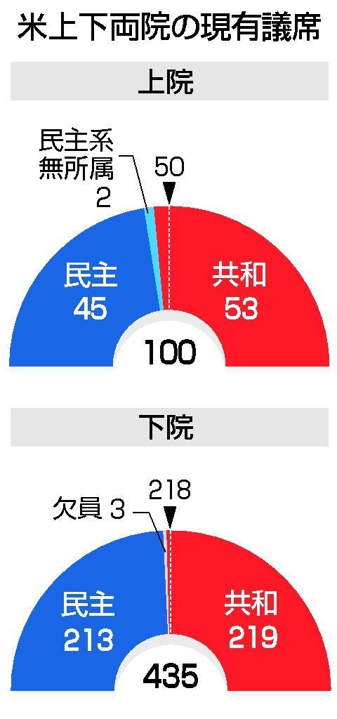 議会の現有勢力は、上院が共和党53、民主党47(同党系無所属2を含む)、下院は共和党219、民主党213。このうち約3分の1改選の上院で民主党が多数派を取り戻すには、接戦が見込まれる4選挙区全てで勝利しなければならず、「奪還はありそうにない」(ジョージ・ワシントン大のトッド・ベルト教授)という見方が大勢だ。