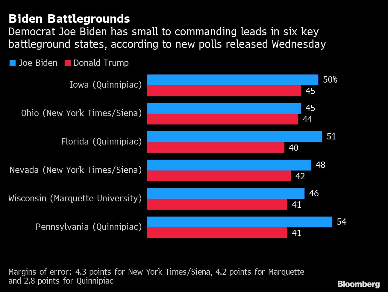ニューヨーク・タイムズ紙(NYT)とシエナ大学の調査では、バイデン氏のリードはネバダ州で6ポイント、オハイオ州で1ポイントとなった。マーケット大学法科大学院の調査ではバイデン氏がウィスコンシン州で5ポイント差を付けている。