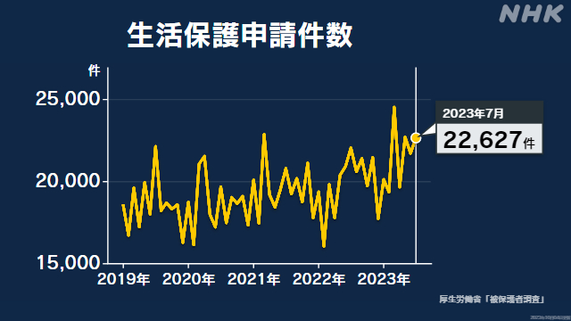 厚生労働省によりますと、ことし7月に申請された生活保護の件数は、全国で2万2627件で、去年7月に比べて611件、率にして2.8%増えました。