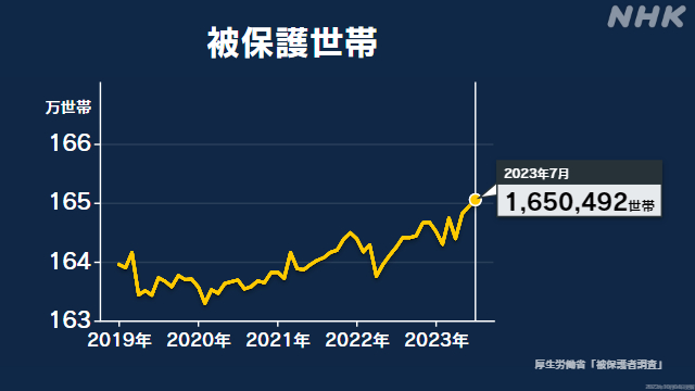 生活保護を受給している世帯は全国で165万492世帯となっていて、現在の調査を始めた2012年以降で最も多くなっています。