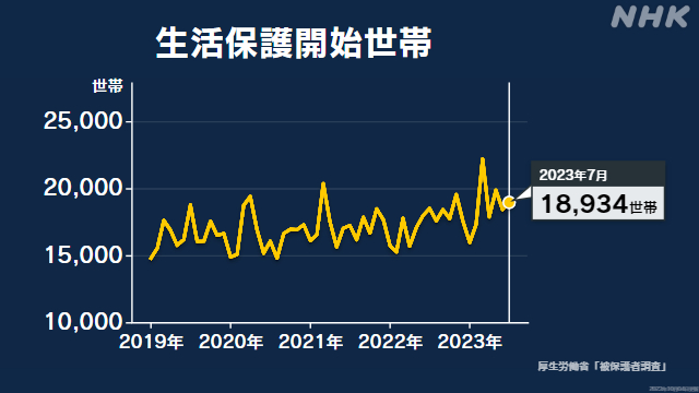 また、ことし7月に新たに生活保護の受給を始めたのは、1万8934世帯で去年7月に比べて2.4%増えました。
