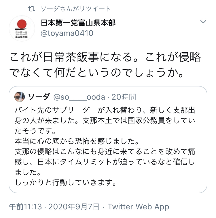 支那の侵略はこんなにも身近に来てることを改めて痛感し、日本にタイムリミットが迫っているなと確信しました。