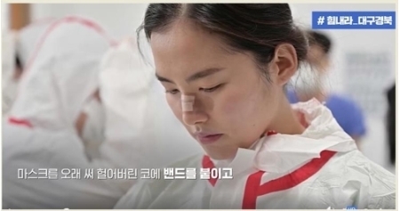 新型コロナウイルスの感染者が集中している韓国南東部・大邱市の啓明大東山医療院の隔離病棟で、マスクですりむけた鼻にばんそうこうを貼って看護に奔走する国軍春川病院所属のキム・ヘジュ大尉の姿をとらえた映像が話題を集めている。