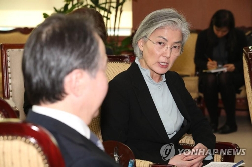 外交部に冨田浩司・駐韓日本大使(左)を呼び出し、日本の入国制限措置に抗議する康京和(カンカン・ギョンファ)外交部長官関連