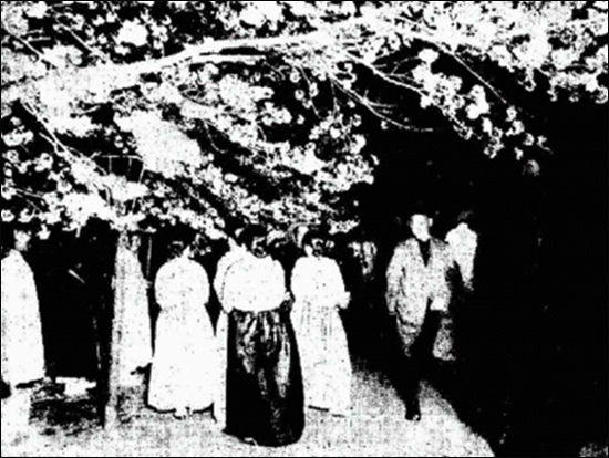 ▲1927年4月23日、東亜日報の記事に掲載された昌慶苑夜の夜桜遊び「昌慶宮の扁額を昌慶苑に変えて2年過ぎた1911年、日本奴たちが自国の精神を朝鮮に植えると昌慶苑に大々的に桜を植えました。少しどころか1,800株を植えたのです。その木々が10年以上育てば豪華に花が咲くでしょう。すると日帝はその桜の花を利用して定例的な祭りを企画して、1924年春にはその練習に用心深く夜桜行事を行いました。」