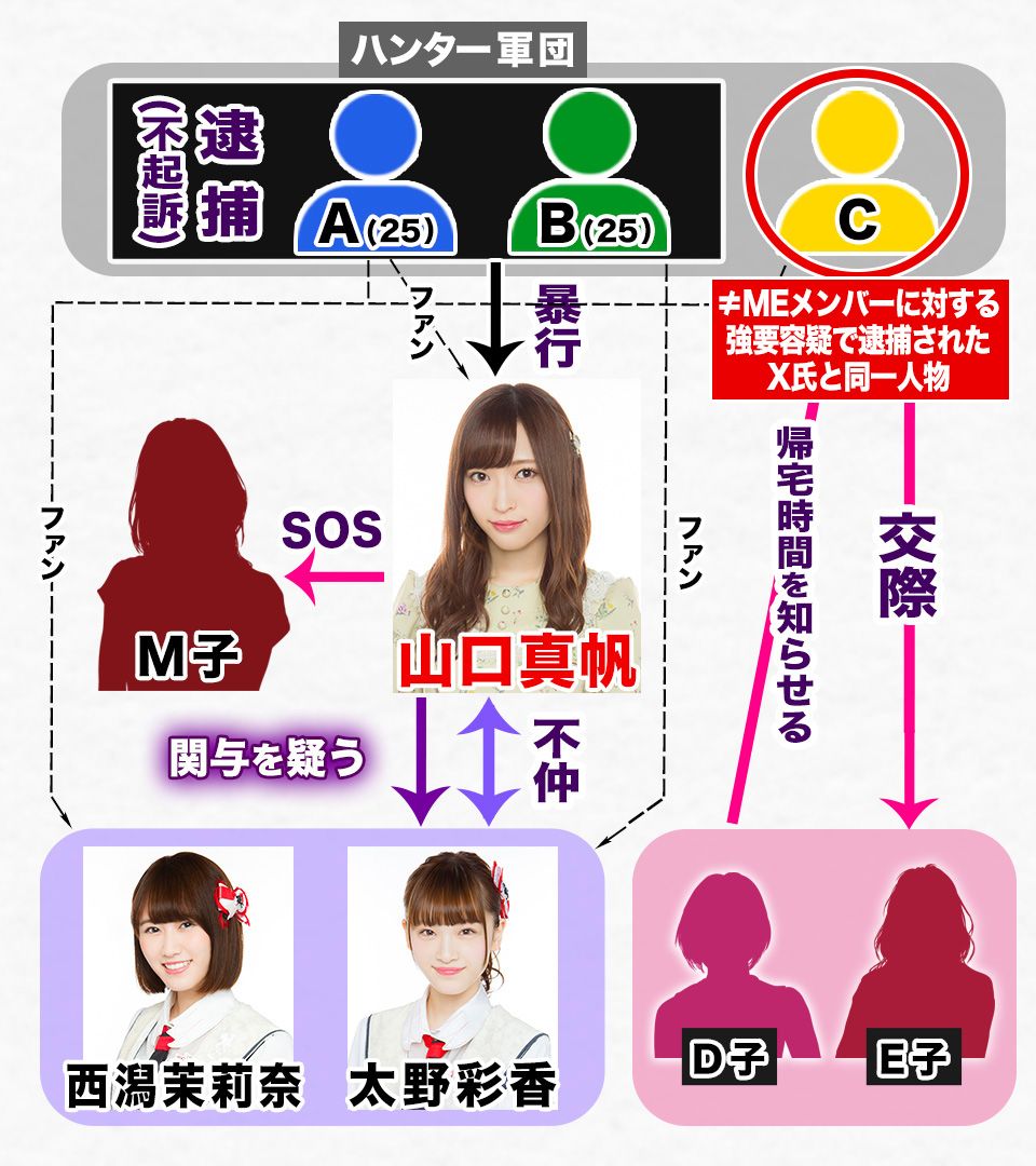 だが、「週刊文春デジタル」が2019年9月7日に報じた暴行直後の“公園音声”の中では、山口が犯人に対し、「なんであやかに(※メンバーの太野彩香)の向かいの家が私って知ってたの?」という質問を投げかけ、被告1(週刊文春デジタルでは「A」として報道)が、「それは相当前にあやかにか誰かに聞いたな」と発言している。