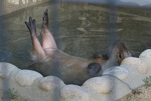 こちらは、王子動物園の動物たちを撮影するツイッターユーザー・ranpi(@ranpi3918)さんが2020年2月9日に投稿した写真。石で囲まれたお風呂に入るカピバラは、お腹を天に向け、前脚をちょこんと折りたたみ、後ろ脚はピンと上に伸ばしている。