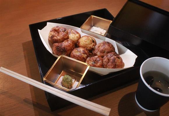 - >高級感のあるお重に入ったたこ焼きは、塩かワサビ、シジミのだし汁につけていただく。