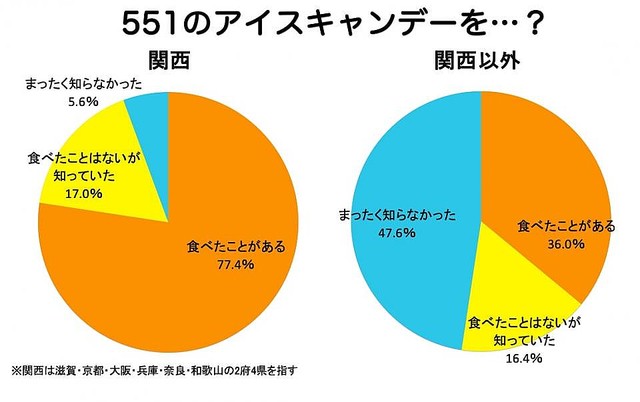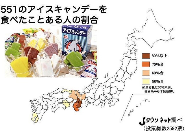 和歌山では100%、京都(98.3%)・大阪(93.4%)・兵庫(96.9%)・奈良(98.0%)では9割以上、滋賀では88.1%が「551のアイスキャンデー」を知っていた。