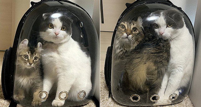 飼い主さんによると、1枚目の写真は2019年10月9日に撮った写真で、2枚目の写真は2020年3月3日に撮った写真とのこと。たった5か月くらいしか経っていませんが、2匹で入っても余裕のあった猫用のキャリーバッグが、今は満員電車状態に……。