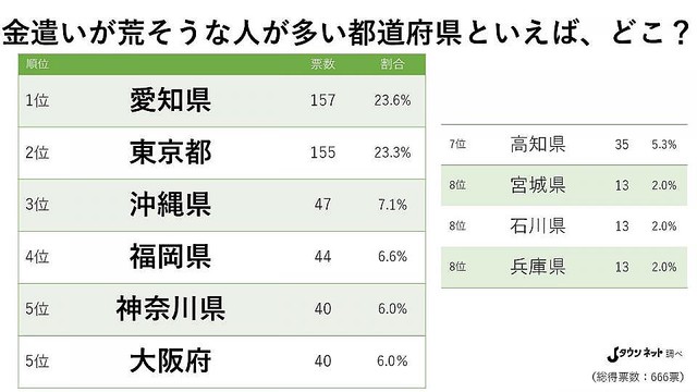 Jタウンネットではそんな疑問に答えるべく、2019年9月27日から20年12月21日までの期間、「金遣いが荒そうな人が多い都道府県といえば、どこ?」という質問で読者アンケートを行った(総得票数:666票)。