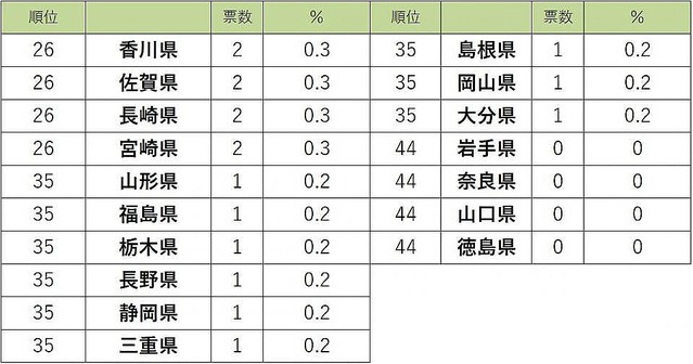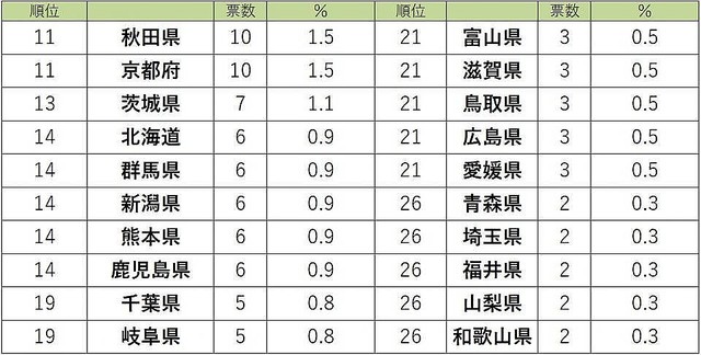 次いで、3位は47票(7.1%)を獲得した沖縄、4位に44票(6.6%)獲得で福岡、5位神奈川・大阪(40票、6.0%)と続いた。