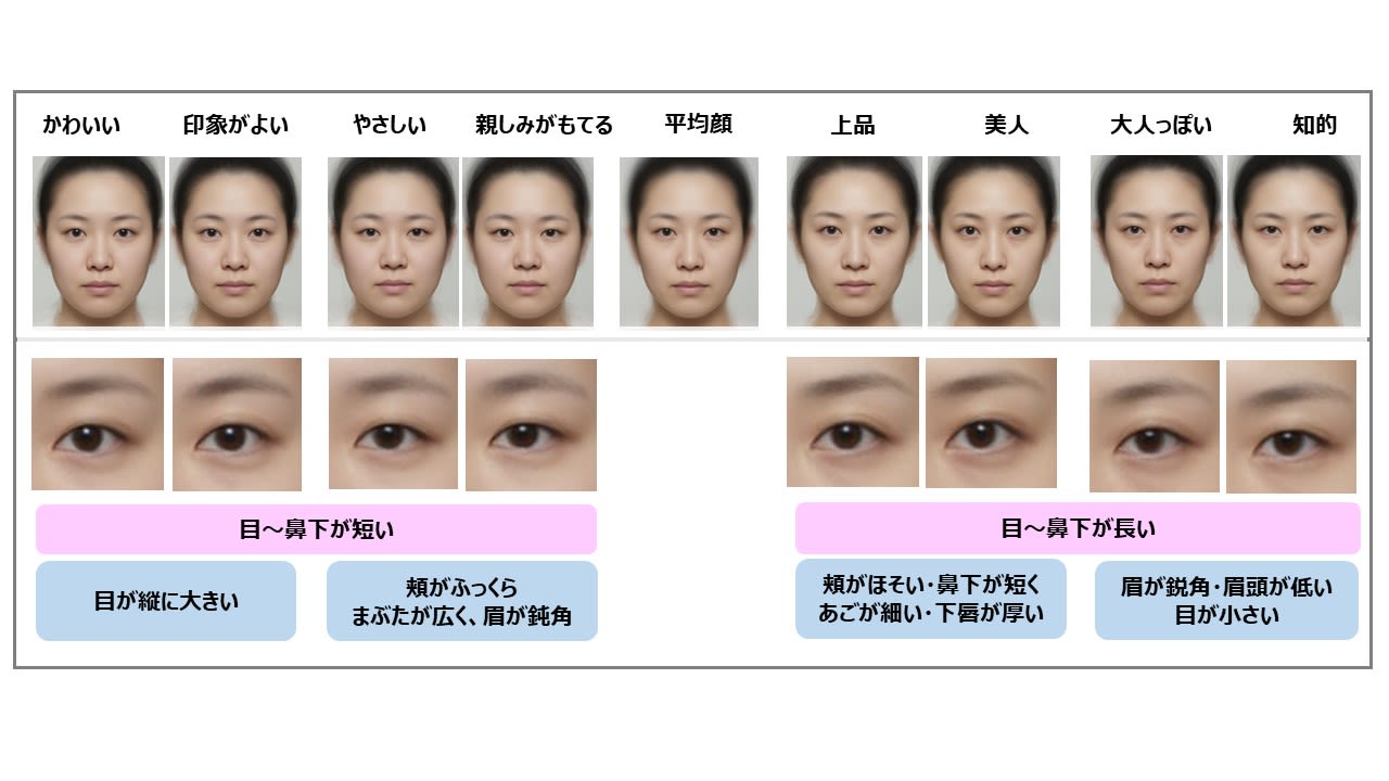 平均顔では、鼻下からあご先までのそれぞれが顔の縦の長さを3等分した比率、目の横幅は顔の横幅の5分の1程度、目と目の間隔は片目の横幅の約1.2倍といった数値が明らかとなった。(以下略、続きはソースでご確認下さい)
