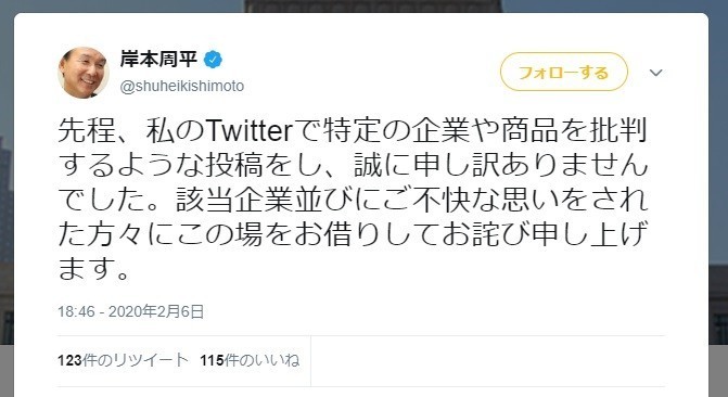 「先程、私のTwitterで特定の企業や商品を批判するような投稿をし、誠に申し訳ありませんでした。該当企業並びにご不快な思いをされた方々にこの場をお借りしてお詫び申し上げます」