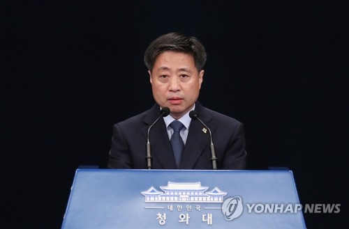 北朝鮮に関する会見を開いた韓国青瓦台(大統領府)の尹道漢国民疎通首席秘書官=17日、ソウル(聯合ニュース)