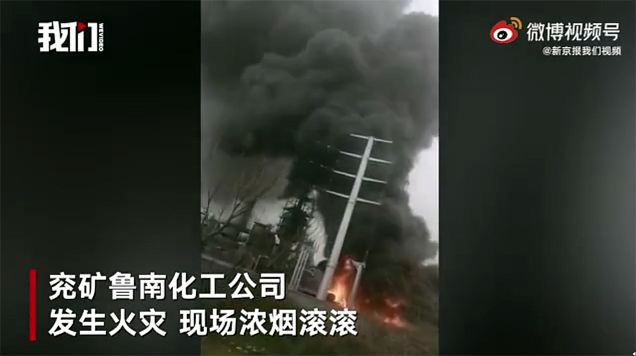 山東省棗荘の化学工場で火災が発生し、煙が空に舞い上がり、悲惨な光景