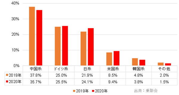 2020年12月、日本のブランドは再びドイツのブランドを23.5%の市場シェアで上回りました。2020年1月から12月にかけて、日本ブランドの売上高は前年比2.4%増の24.1%、ドイツブランドの売上高は前年比4.6%減の25.5%となった。