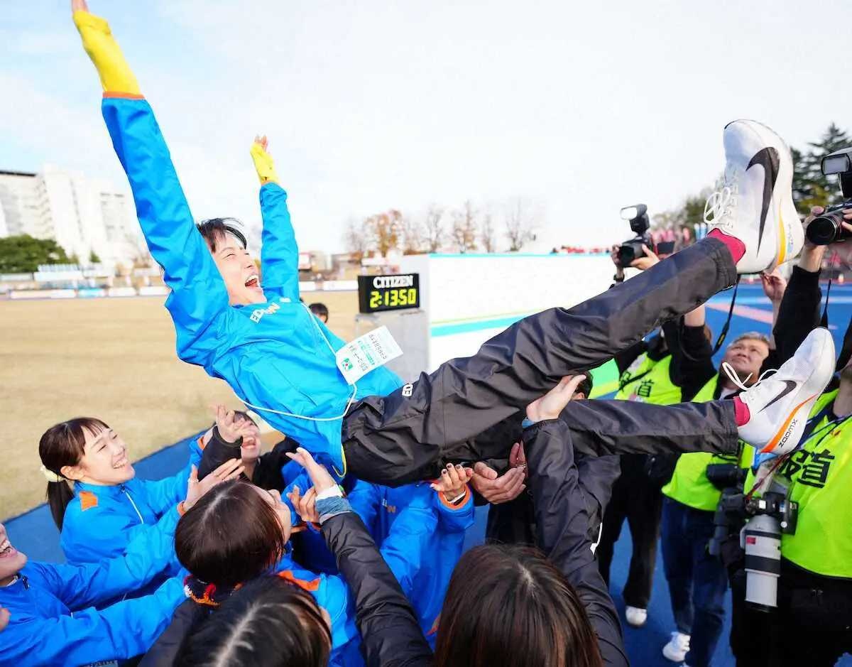 最終6区(6・795キロ=区間賞は第32回大会のデンソー・石橋麻衣20分48秒)は、エディオン・平岡美帆が首位でスタート。2位のJP日本郵政グループの小暮真緒から追走されたが、粘って首位を渡さず、悲願のゴールテープを切った。