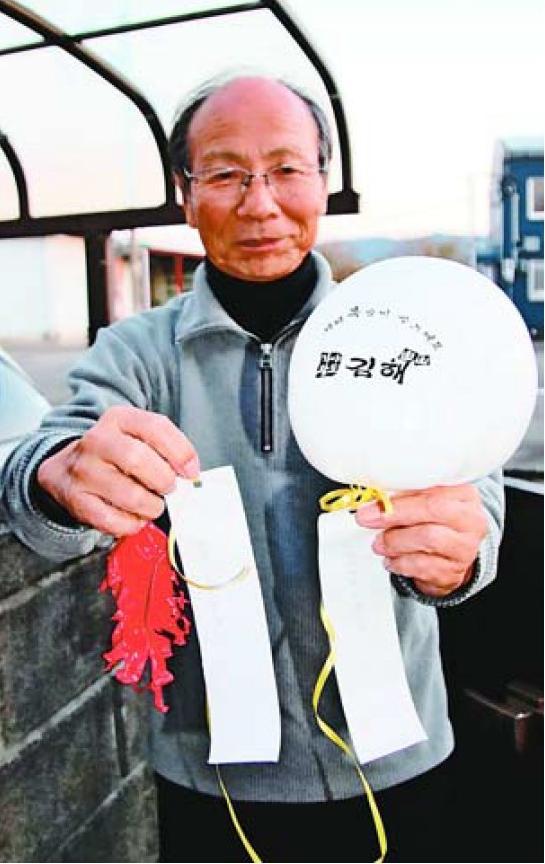風船には「明けましておめでとうございます」の文字の下に、韓国南部の都市「金海」と記されている。カードには「私の家族、健康になって」「宝くじで1等当たってほしい」と手書きされていた。
