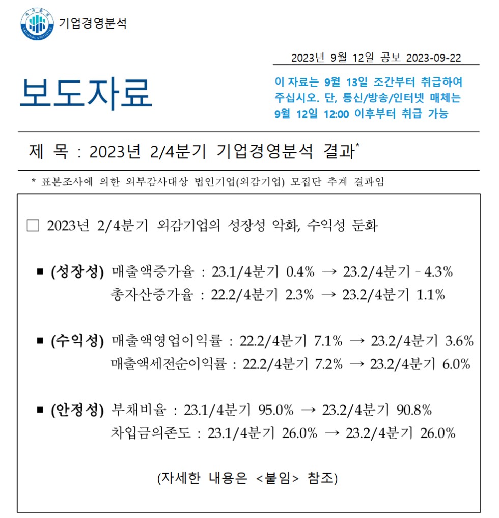 2023年09月12日、『韓国銀行』が「2023年第2四半期企業経営分析」を公表しました。