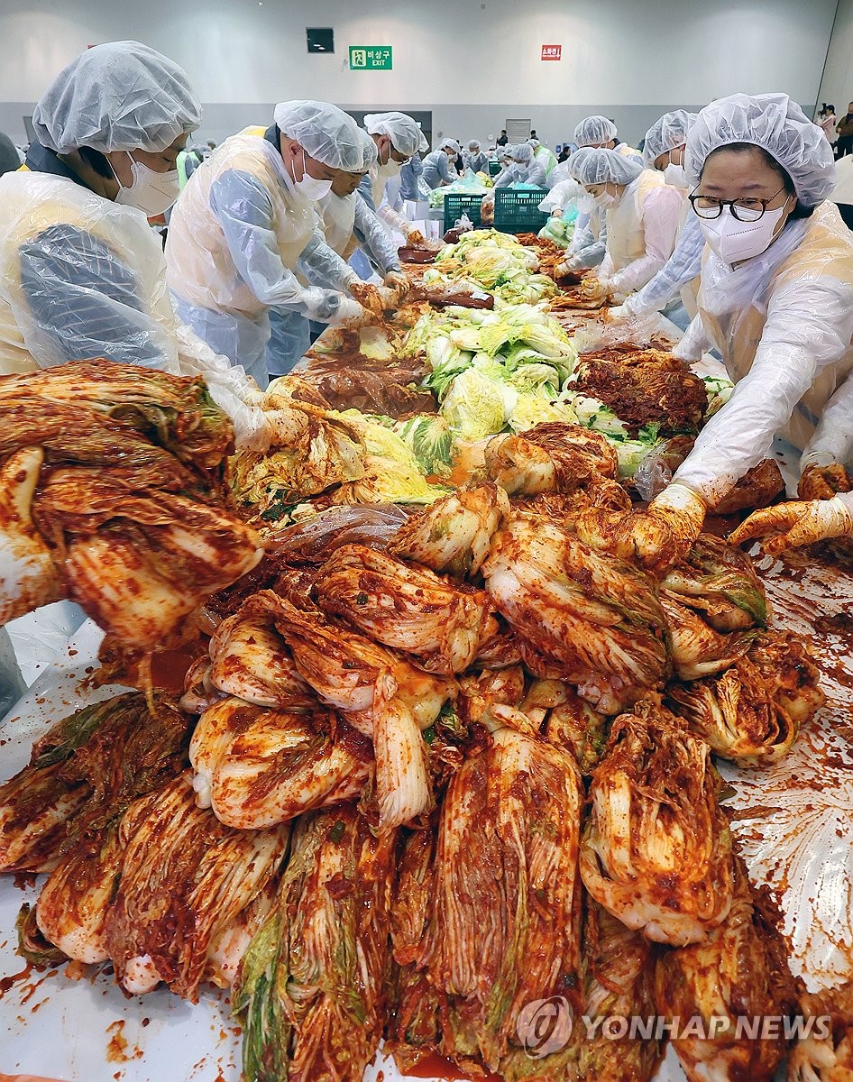 韓国南部・釜山の展示コンベンションセンター、BEXCOでキムジャン(越冬用のキムチ漬け)のイベントが行われた。ボランティア約1000人が漬けたキムチは釜山の低所得層約4700世帯に届けられる=10日、釜山(聯合ニュース)