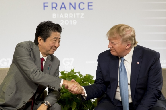 ▲ アメリカのトランプ大統領と握手を交わす日本の安倍晋三首相(2019年8月25日)