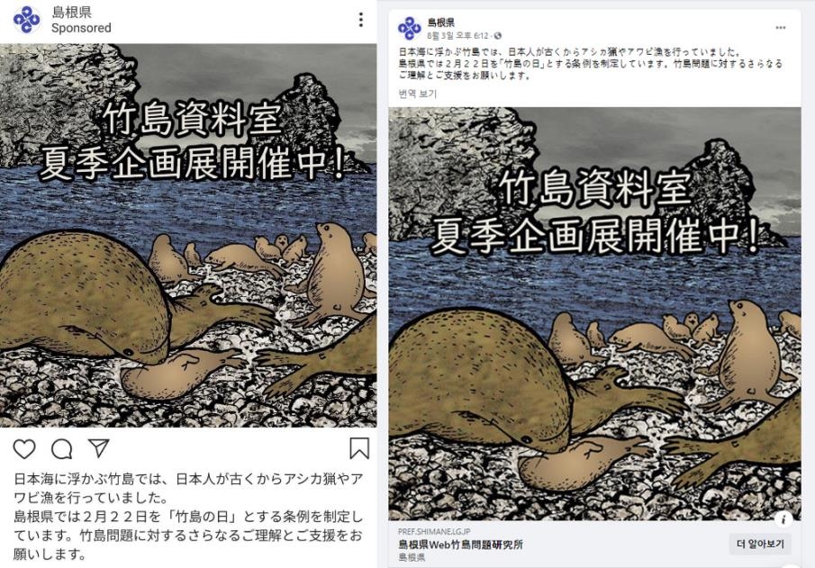 誠信(ソンシン)女子大学校の徐ギョン徳(ソ・ギョンドク)教授は3日、日本の島根県が最近『竹島(日本が主張する独島の名称))資料室夏季企画展』を開催し、Facebook(ペイスブク)やInstagram(インスタグレム)などの各種社会的関係網サービス(SNS)の広告で、独島を深刻に歪曲していると明らかにした。