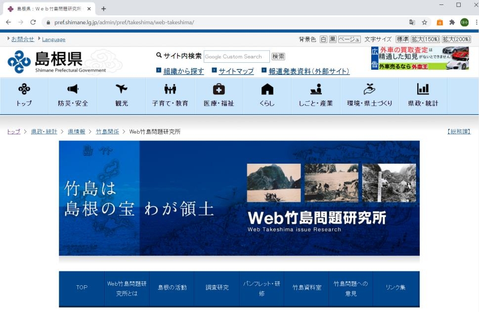 ▲ 島根県傘下の『竹島問題研究所』のサイト。