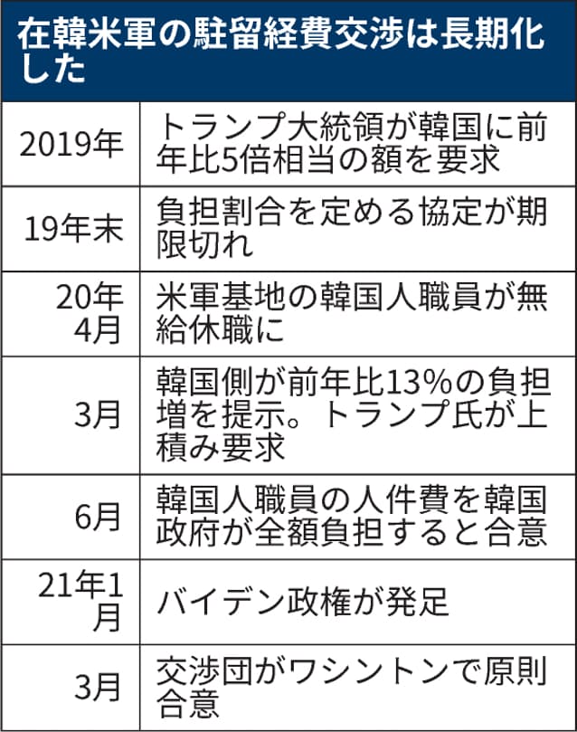 米韓両国は19年に交渉を始めた。しかし、トランプ前大統領が前年比で5倍に相当する50億ドル(約5400億円)近くを要求し、協議は難航した。20年に入り、韓国側が負担を19年比で13%増やす案を示したが、トランプ氏はさらに上積みを求めた。