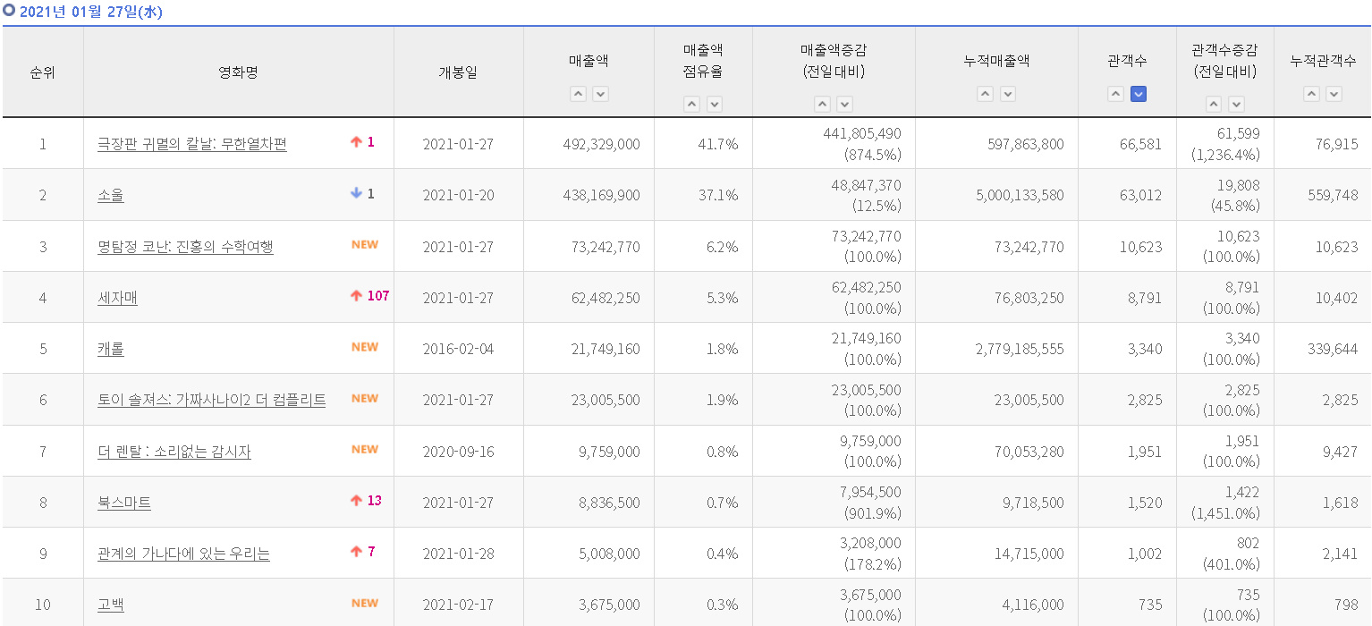 ディズニーピクサーアニメ「ソウル」(監督ピート・ドクター)は6万3015人の観客を動員し2位を、日本アニメ「名探偵コナン:真紅の修学旅行」(監督山本靖一郎)は、1万623人で3位を記録した。