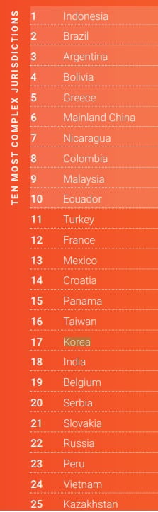 グローバル コンサルティング会社TMFグループが全世界77ヶ国の各種規制法令と会計制度、法人税、賃金水準、労働柔軟性、デジタル化などを分析して24日発表した「2020年グローバル事業複雑性指数(GBCI)」で韓国は17位に上がった。
