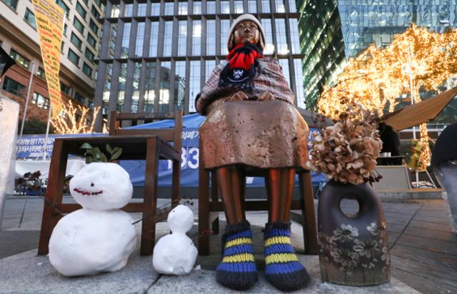 ▲8日ソウル鍾路区の旧日本大使館前少女像に雪だるまが置かれている。ニューシス1.重大な欠陥が発見された合意なので死文化してください。