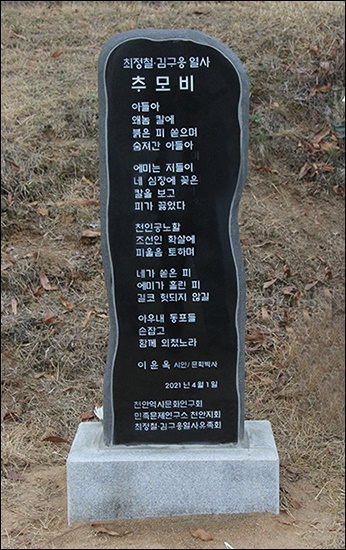 しかし、昨日(4月1日)、墓場で記者はうれしくて涙を流した。そこに集まった人々もやはりそうだろう。参席者は追悼碑除幕を終えて、チェ・ジョンチョル、キム・グウン烈士の名前を呼び万歳を叫んだ。102年ぶりに佳田里の墓場で鳴り響いた万歳の叫び声に多分チェ・ジョンチョル、キム・グウン烈士も喜びの涙を流しただろう。