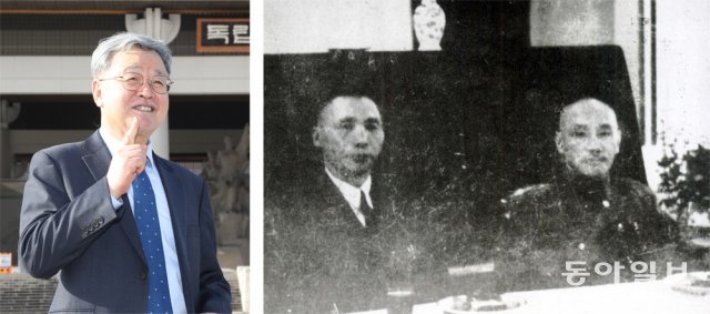 25日、ハン・シジュン新任独立記念館館長が忠南天安市独立記念館民族の家の前で就任の抱負を発表している(左側写真)。ハン館長はカイロ会談を控えた1943年7月、白凡と蒋介石(右側写真、左側から)の会合事実を明らかにするなど日帝に対抗した韓中の共同抗戦の史実研究で大きな成果を上げた。天安=キム・ドンジュ記者・東亜日報DB報勲処傘下独立記念館長に独立闘士子孫のうち名望家が任命されてきた要人慣行を破って独立運動史を研究した正統学者が初めて任命された。これに伴い、来年、韓中修交30周年をむかえて独立記念館の中に『韓中共同抗戦記念館』を新設する方案が推進される。