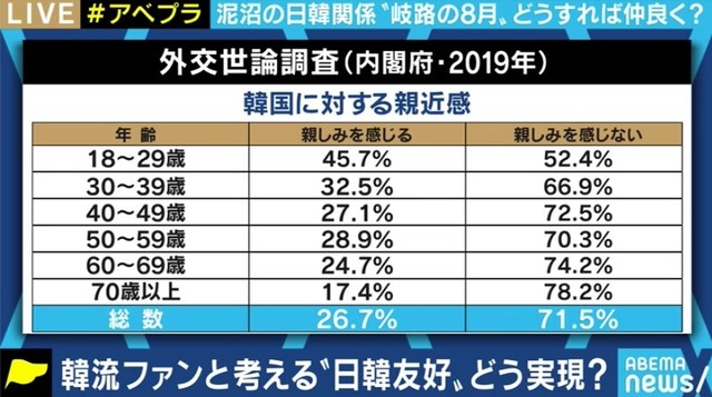 竹島の領有権を巡る問題や元徴用工問題など、解決の糸口が見えないまま悪化する日韓関係は、“岐路の8月”とも言われている。実際、外交世論調査(内閣府・2019年)の「韓国に対する親近感」を年代別に見ると、「親しみを感じない」が8割近くに達している。