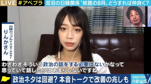 韓国人の交際相手との日常を撮影した動画を投稿している日韓カップルYouTuberりんかさん(19)は、「お互いの国があまり仲良くないのは分かっているので、わざわざ政治の話をする必要はないかなって思っている。韓国を一種の“コンテンツ”として捉え、政治と切り離して触れてみることから初めるのが良いのかなと思う」と話す。