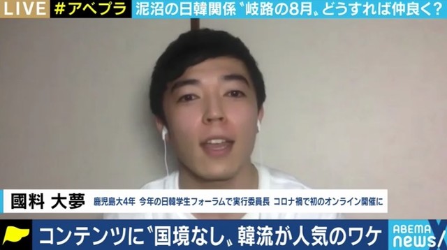 - K-POPがきっかけで韓国に興味を抱いたという國料大夢さん(鹿児島大学4年生)は、日韓の大学生による国際討論・交流プログラム「日韓学生フォーラム」の実行委員長を務める。1986年に始まったこのプログラムは「非政治、非営利、非宗教」を掲げ、両国の学生が毎年8月に約2週間、寝食を共にしながら理解を深める活動を続けてきた。新型コロナウイルスの影響で今年は初のオンライン開催となったが、日本の大学生11人、韓国の大学生15人が「Beyond The Wall」を合言葉に13日から交流を続けている。