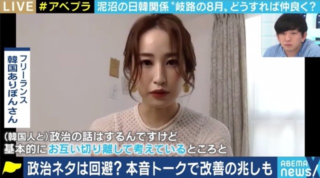 韓国ありぽんさんは「“冬ソナ”にハマった母親が韓国のテレビ番組を一日中観ていた」ことがきっかけで興味を懐き、今や韓国ビジネスにも関わっているという。「韓国人とは政治の話もするけど、“韓国人だから”“日本人だから”といった対立は経験したことがない」としつつも、「韓国を一種の“コンテンツ”として捉えて、文化と政治は切り離して体験していただくことが重要ではないかと思う」とした。
