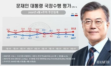 韓国世論調査機関“リアルメーター”が去る21日から25日まで、韓国内 満18歳以上の男女2511人を対象に実施した9月4週目の週間集計の結果を、今日(28日)発表した。これによると、文大統領の国政遂行支持率は先週より1.7%下落の44.7%となった。