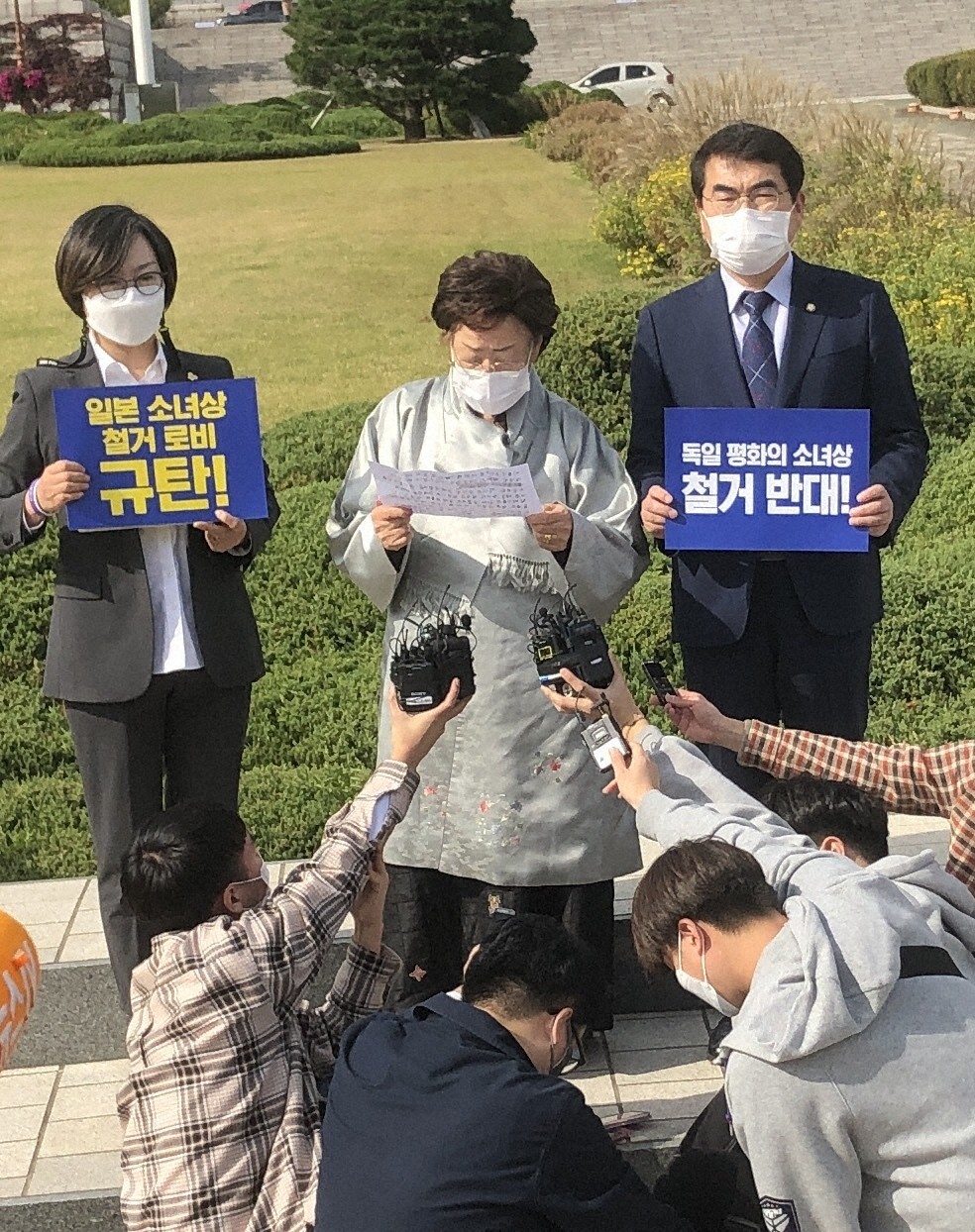 ドイツの少女像設置問題で、韓国人元慰安婦の李容洙(イヨンス)さん(91)は14日、ソウル市内の国会議事堂前で記者会見し、「ドイツは誤った歴史を正す先頭に立ってきた国だ。少女像撤去は絶対にあってはならない」と撤去反対を表明した。会見には、寄付金流用問題で対立している「日本軍性奴隷制問題解決のための正義記憶連帯」(正義連)の李娜栄(イナヨン)理事長も同席した。