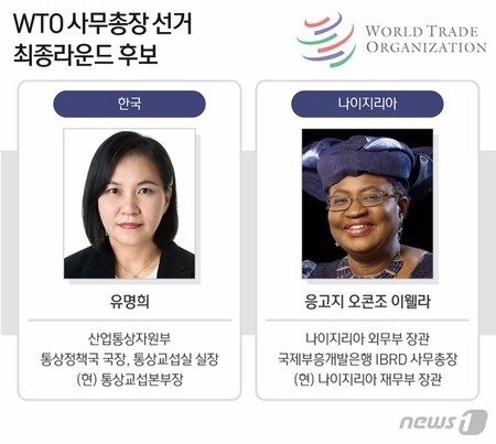 青瓦台(韓国大統領府)は今日(29日)、世界貿易機構(WTO)事務局長選出のための最終ラウンドにおける加盟国(163か国)の支持調査で、ナイジェリアのヌコジ・オコンジョイウェアラ候補が104票を獲得し、韓国のユ・ミョンヒ(兪明希)通商交渉本部長を上回ったという報道が出ていることについて「一方的な主張だ」と反発した。