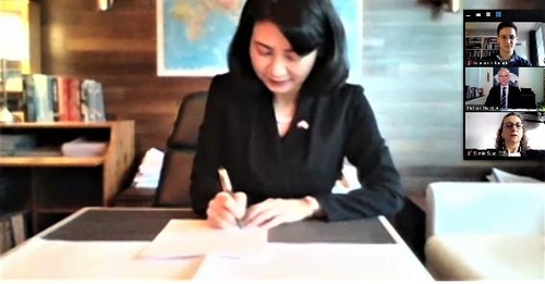 24日、オンラインで署名式を行う南英淑・駐ノルウェー大使(外交部提供)=(聯合ニュース)関連