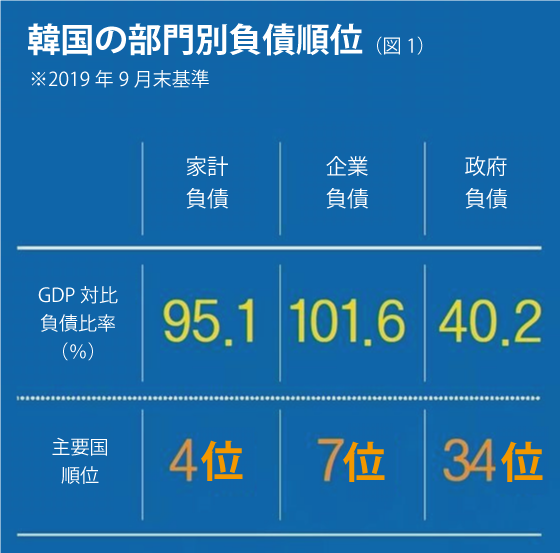 しかし、OECDの統計の横にもう一つの負債統計がある。OECD加盟国別の民間負債統計だ。韓国の民間信用(家計と企業の貸出及び債権)は今年3月末基準で3866兆ウォンに達し、GDP比201.1%を記録した。主要43カ国の平均(156.1%、2019年末基準)より45%も高い。一言で「借金共和国」というわけだ。家計への住宅担保貸出が多い上、借金で延命する限界企業が増えたからだ。国際決済銀行(BIS)は最近、「韓国の民間負債の増加速度があまりにも速い」とし、警報レベルを「注意」に引き上げた。所得対比民間の負債が長期傾向で見ると、中国よりも危険だと警告した。(図1)