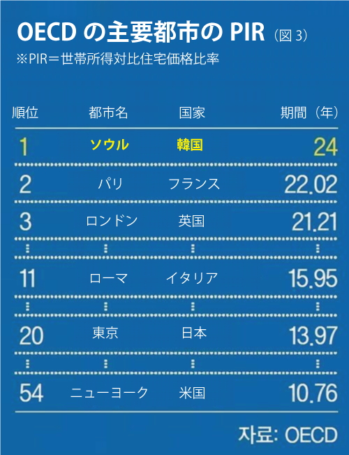 何年間の所得で平均価格の住宅を購入できるかをを表すPIR(世帯所得対比住宅価格比率)も同じだ。今年、ソウルのPIRは24年で、ロンドン(21.21年)とパリ(22.02年)を抜いた。ちなみに東京は13.97年でニューヨークは10.76年だ。文在寅政府に入って、ソウルのマンションはOECDの都市の中で圧倒的1位に跳ね上がった。 (図3)