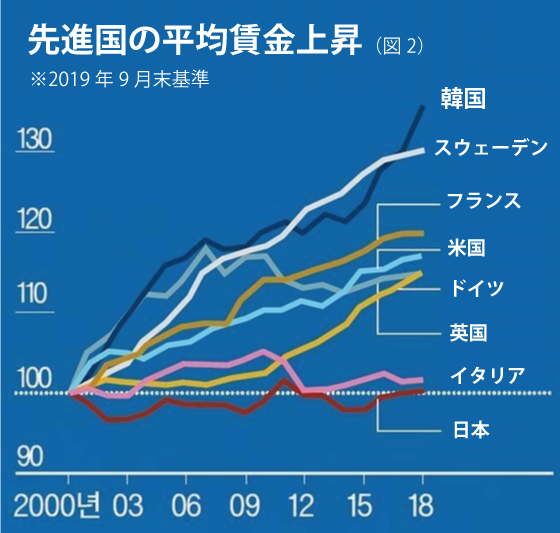 もう一つ視線を向けるべきOECDの統計がある。2000年以降の国家別平均賃金上昇率だ。(図2)日本は「失われた20年」の後遺症で足踏み状態にあり、米国や英国も15%程度上がっただけだ。これに比べて、韓国の平均賃金は36%上昇した。依然として左派学者らは「2000年以降、賃金上昇率が低下しているのは明白な事実」と主張しているが、これは「低成長による低い賃金の増加」と見るのが妥当だ。OECDの統計には、国家別の時間当たりの労働生産性の順位もある。韓国は米国・ドイツ・日本などを大きく下回る28位だ。にも関わらず、民主労総は来年、最低賃金を25.4%引き上げることを要求している。時給では今年(8590ウォン)よりはるかに多い1万770ウォンに相当する。