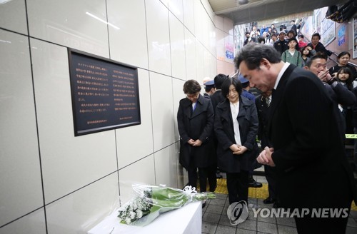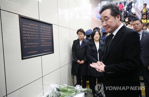 【東京聯合ニュース】韓国の李洛淵(イ・ナクヨン)首相が22日午後、JR新大久保駅を訪れ、2001年に同駅ホームから転落した人を救おうとして亡くなった韓国人留学生、李秀賢(イ・スヒョン)さん(当時26)の追悼碑に献花した。