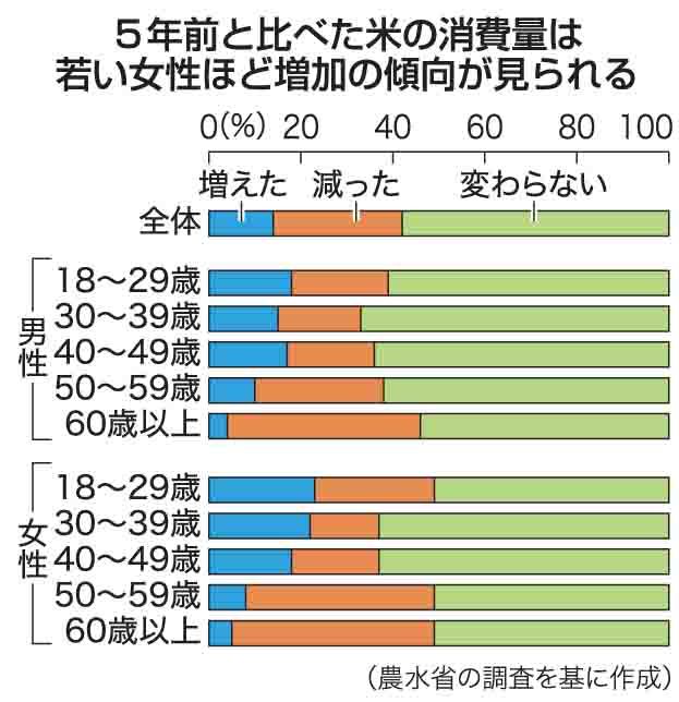 同省が初めて行った。2、3月にインターネットを活用して3231人から回答を得た。5年前と比べた米の消費量は「変わらない」が59%と最も多かった。