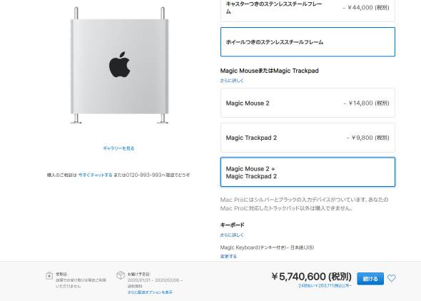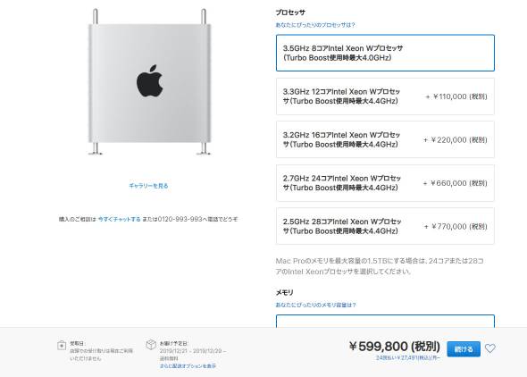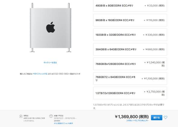 ただ、28コアCPUを選ぶとプラス77万円(税別)、1.5TBメモリに至ってはプラス275万円(税別)と、お値段もプロ仕様。とりあえず全部盛っておくとマックスで574万円(税別)、消費税だけでMacBook Proが何台か買えそうなモンスターマシンができあがります。